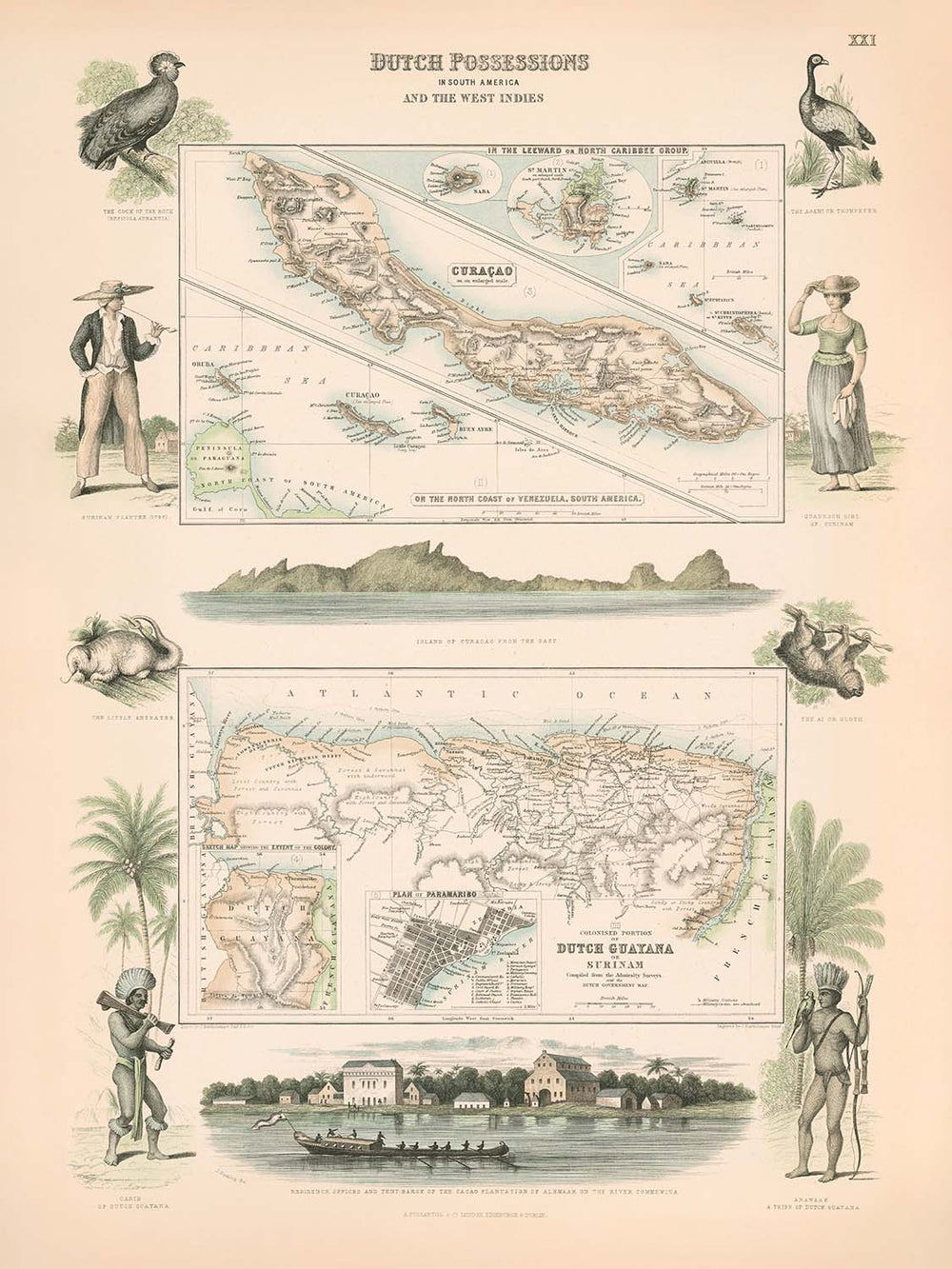 - Decorative map showing Curaçao, the Leeward Islands, and Surinam (Dutch Guayana)