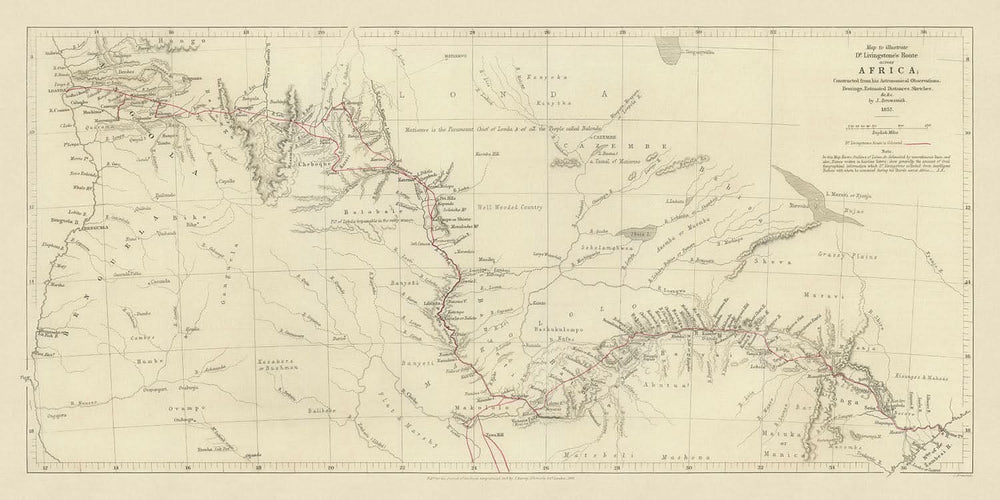 Embárcate en un viaje a través de la historia con este exquisito mapa que ilustra la legendaria ruta del Dr. David Livingstone a través de África, elaborado por el estimado cartógrafo John Arrowsmith en 1857. Este mapa no es simplemente una representación de características geográficas; es un testimonio del espíritu de exploración y descubrimiento durante el siglo XIX. Resaltado en rojo, el camino de Livingstone captura vívidamente su monumental travesía desde Linyanti hasta Quelimane, un viaje que amplió la comprensión europea del continente africano. Este mapa se erige como una notable fusión de ciencia y aventura, construido a partir de meticulosas observaciones astronómicas y enriquecido por las interacciones del explorador con las comunidades locales.