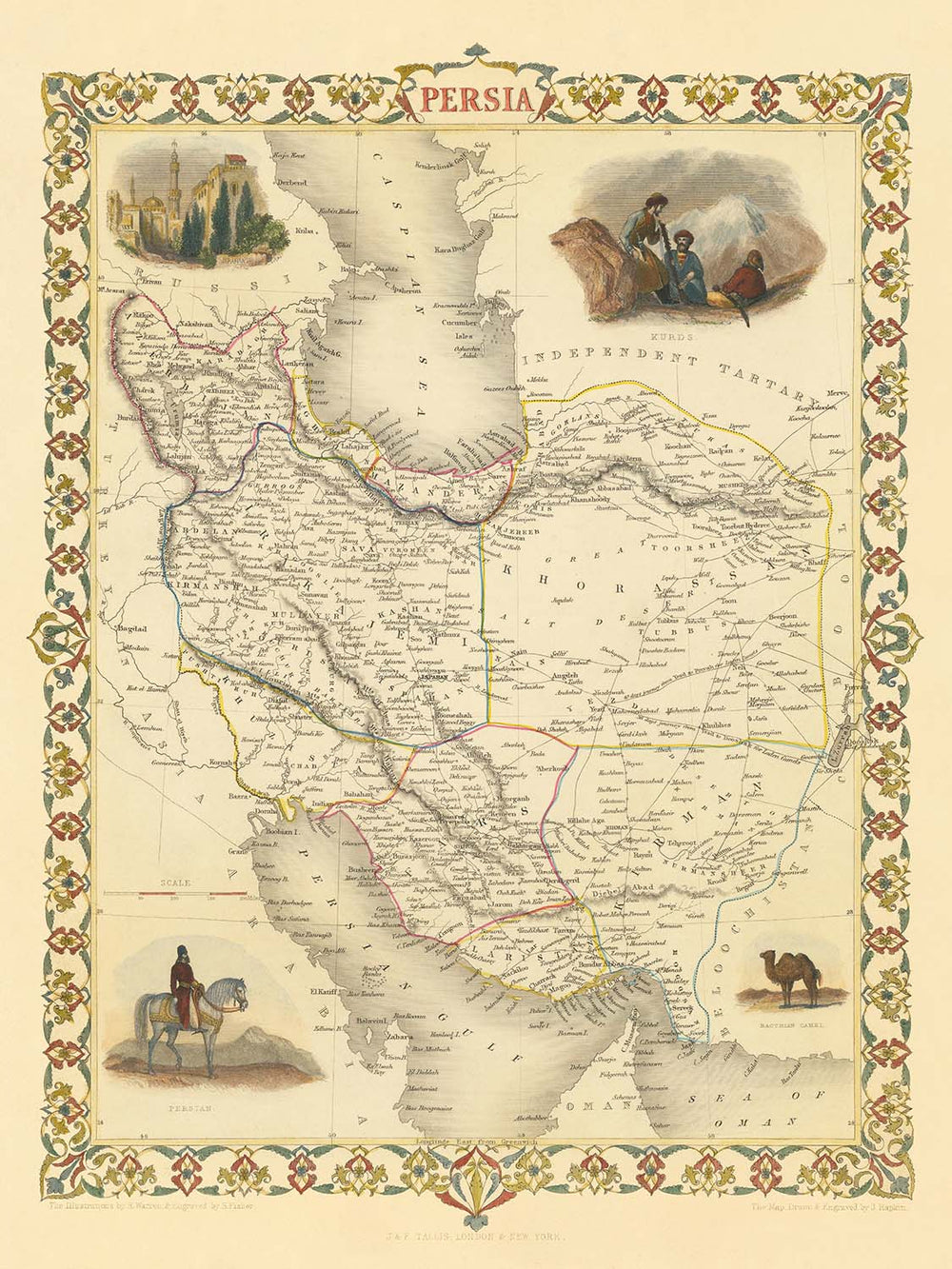 Step into the rich tapestry of 19th-century cartography with “Persia,” an exquisite map engraved by the renowned John Tallis in 1851. This original work, produced for R. Montgomery Martin’s celebrated Illustrated Atlas, stands as a testament to the artistry and precision of one of the last great decorative mapmakers. Tallis’s maps are highly prized for their captivating vignettes and meticulous attention to detail, and “Persia” is no exception—offering a vivid window into the heart of a region steeped in history, culture, and natural grandeur.