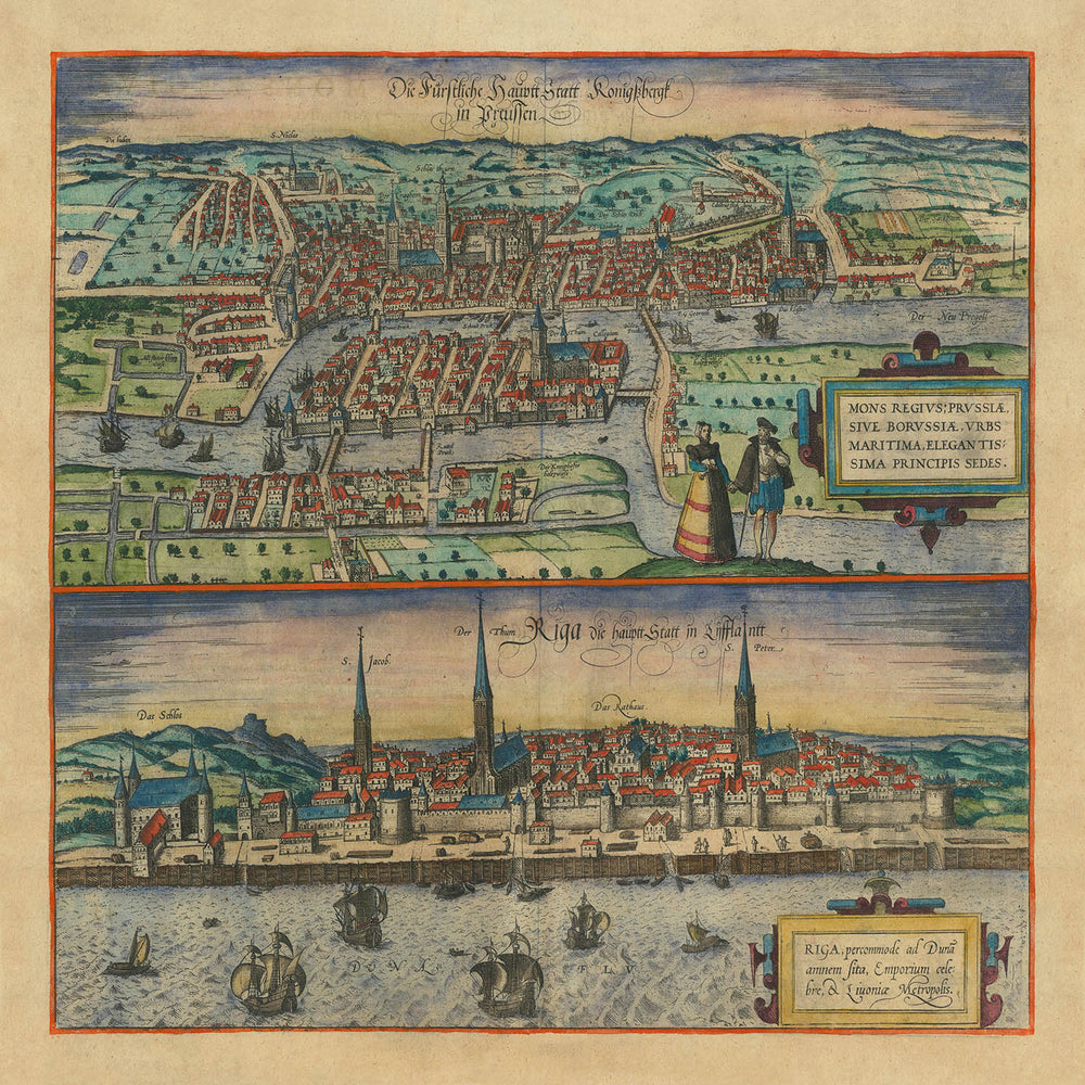 Antigua mapa de Kaliningrado y Riga por Braun y Hogenberg, 1599: Iglesias, Torres, Barcos, Puertos, Vestimenta