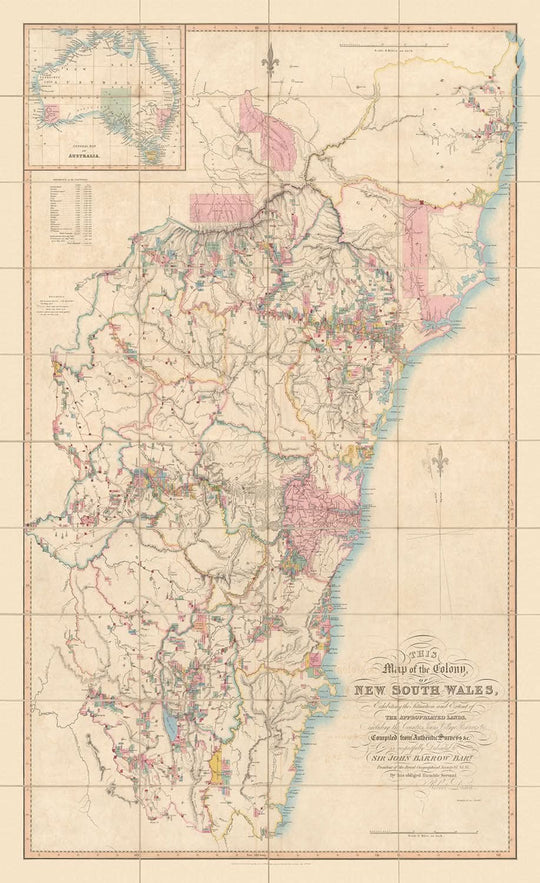 El mapa también destaca las ciudades y pueblos en expansión que se convertirían en la columna vertebral de la moderna Nueva Gales del Sur. Desde las bulliciosas calles de Sídney hasta los asentamientos emergentes de Newcastle y Wollongong, cada ubicación está marcada con precisión. El mapa captura la esencia de una sociedad en transformación, donde se construían nuevas ciudades e infraestructuras y se emprendían misiones exploratorias. Es una celebración del progreso y un testimonio del espíritu perdurable de exploración y asentamiento que definió los primeros años de la historia australiana.