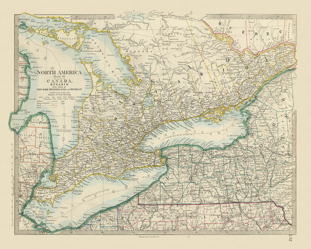 El mapa de Letts también captura la importancia histórica de las regiones que retrata. Ciudades como Toronto, Ottawa y Detroit están marcadas como centros urbanos en crecimiento, listas para el desarrollo. La representación de estas ciudades en el mapa, junto con pueblos y asentamientos más pequeños, proporciona una instantánea de un paisaje dinámico y en evolución. Las fronteras políticas, cuidadosamente trazadas, reflejan las lealtades cambiantes y las identidades nacionales en auge que caracterizaron este período en la historia de América del Norte.
