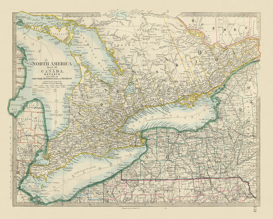 El enfoque del mapa en Ontario, la provincia canadiense más poblada, junto con partes de Nueva York, Pennsylvania y Michigan, subraya la interconexión de estas regiones. La representación detallada de ciudades clave y redes de transporte habla del rápido crecimiento y expansión de la era. Los ferrocarriles, un símbolo de progreso y prosperidad económica, se entrelazan a través del mapa, conectando partes distantes del continente y facilitando el comercio y el asentamiento. Esta intrincada red no solo destaca los avances tecnológicos de la época, sino también la importancia estratégica de estas rutas en la configuración del futuro de América del Norte.