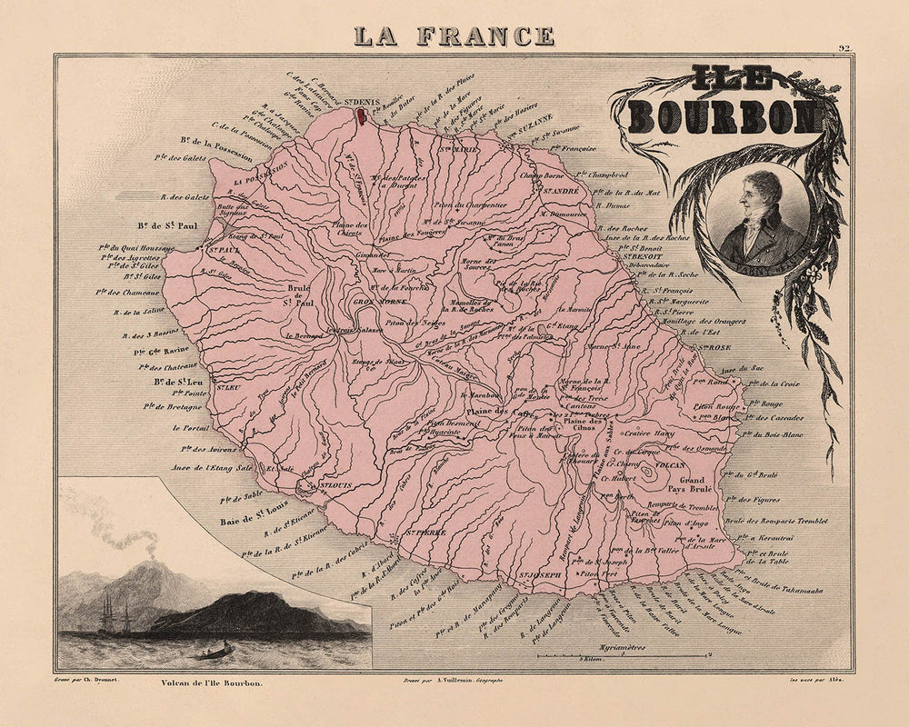 Geographically, the map presents Reunion Island in all its dramatic splendor. The rugged volcanic terrain is unmistakably rendered, with the island’s central volcano (“Volcan”) standing as a dominant natural landmark. The surrounding Indian Ocean is gracefully depicted, emphasizing the island’s remote yet strategic position. Administrative boundaries are crisply drawn, providing insight into the colonial governance of the period, while the mountainous interior and lush coastal regions are brought to life through Vuillemin’s skilled hand. This careful attention to topography and land use offers a rare window into the environmental and political landscape of the time.