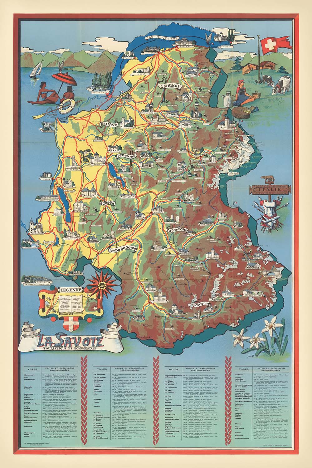 Beyond its aesthetic appeal, "La Savoie Touristique et Monumentale" stands as a testament to the enduring allure of Savoie—a region where natural beauty and human achievement intertwine. This map is more than a historical artifact; it is a celebration of a landscape shaped by centuries of history, faith, and innovation. Whether admired for its artistry or cherished as a cultural document, Flornoy’s map invites collectors and connoisseurs alike to embark on a journey through one of France’s most captivating provinces, where every mountain, lake, and monument tells a story.