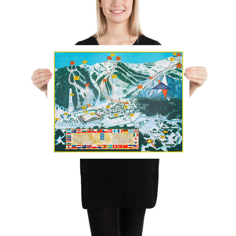 Weld Wilkie, celebrated for thematic, pictorial cartography, deploys his full repertory here. The landscape is rendered with painterly shading and crisp linework; athletes in motion populate the slopes and ice, giving the map narrative energy without obscuring legibility. Informative captions cue the eye from venue to venue, while a handsome cartouche presents a concise historical overview of the Olympic Winter Games, nodding to landmarks from Chamonix and St. Moritz to Cortina d’Ampezzo. A procession of national flags enlivens the borders, transforming geography into a pageant of nations. The result is both art and information—a cheerful, authoritative guide that doubles as an emblem of Olympic ideals translated into Californian topography.
