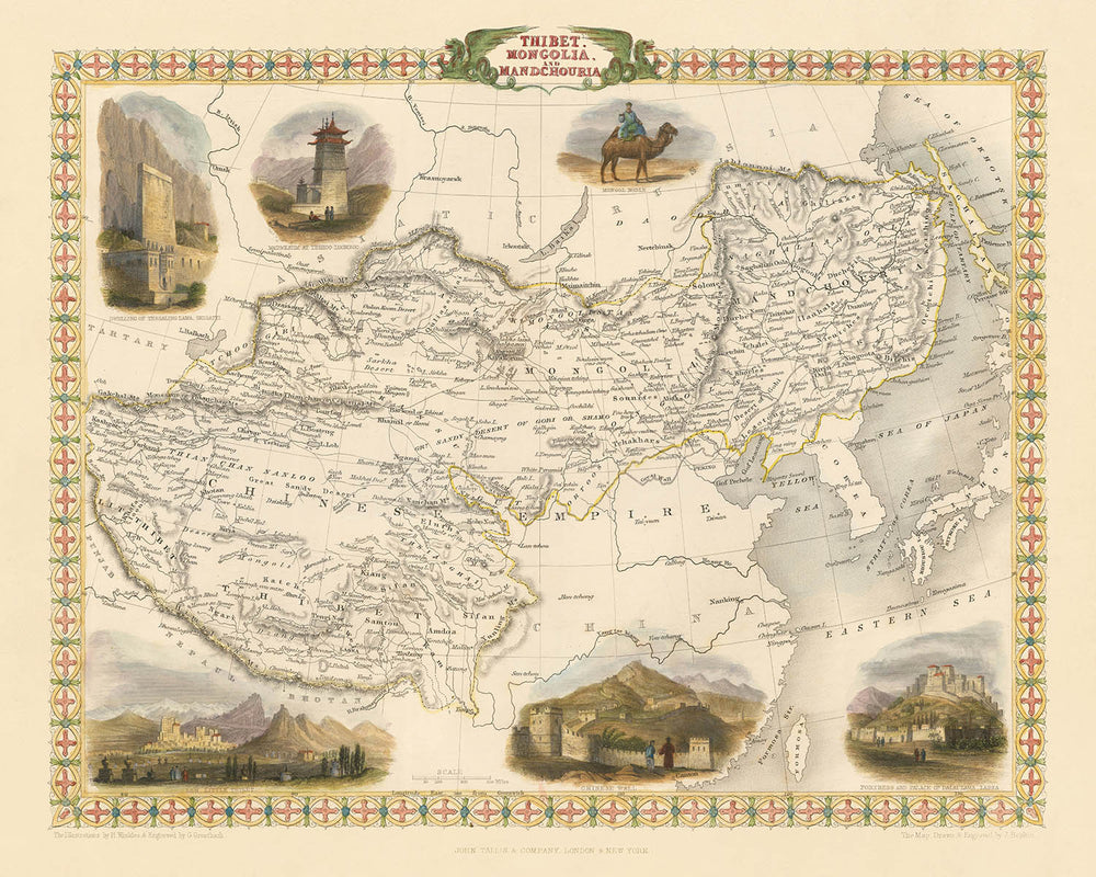 John Tallis, renowned as one of the last great decorative mapmakers, imbued his works with a sense of wonder and discovery. His maps are distinguished not only by their geographic precision but also by their ornate embellishments—here, a series of exquisite vignettes surround the map, each capturing the spirit and grandeur of the lands depicted. From the majestic Dwelling of the Tessaling Lama to the imposing Fortress and Palace of the Dalai Lama, these illustrations evoke the mystery and allure that so fascinated Victorian audiences.