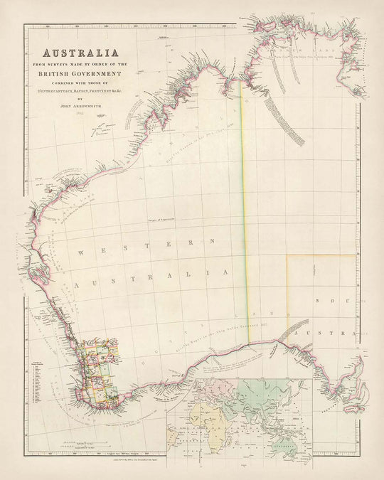 Adéntrese en el fascinante mundo de la cartografía del siglo XIX con "Australia a partir de los estudios realizados por orden del gobierno británico" de John Arrowsmith. Este exquisito mapa, elaborado en 1844, muestra el floreciente conocimiento geográfico de Australia durante una época de exploración y descubrimiento. Arrowsmith, una figura destacada en el mundo cartográfico, era famoso por su precisión y su maestría, lo que hace de este mapa un verdadero testimonio de su experiencia. El mapa describe con elegancia los vastos y en gran parte inexplorados territorios de Australia Occidental, lo que ofrece una visión del cambiante paisaje del continente.