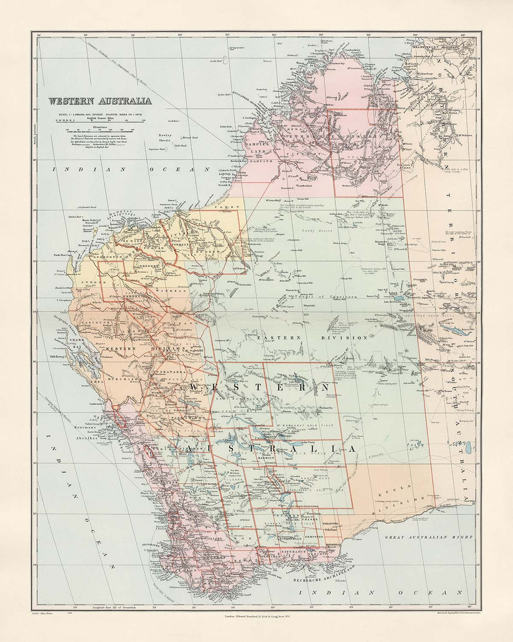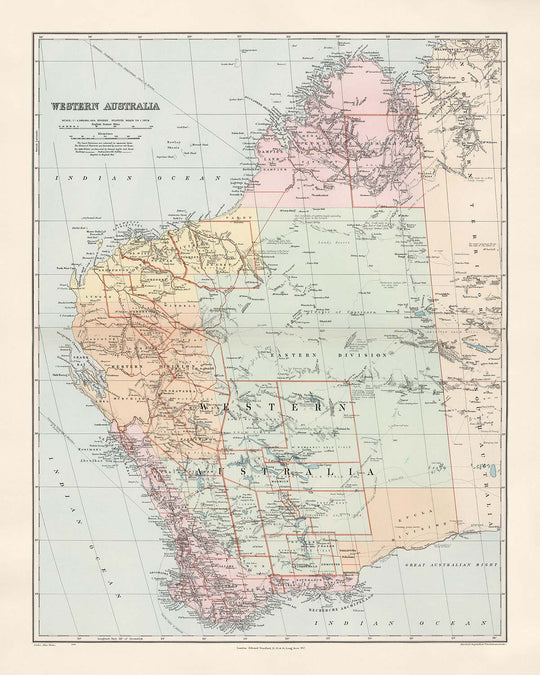 Step into the golden age of exploration with "Western Australia. Northern Territory.", an exquisite 1904 map crafted by the distinguished London cartographer Edward Stanford. This map, originally part of Stanford’s celebrated atlas series, offers a vivid snapshot of Western Australia and the Northern Territory at the dawn of the twentieth century. The title itself evokes a time when these vast regions were still being charted, their boundaries, settlements, and landscapes meticulously recorded for posterity. Stanford’s maps are revered for their accuracy and artistry, and this piece is no exception, blending scientific precision with the elegance of full color lithography.