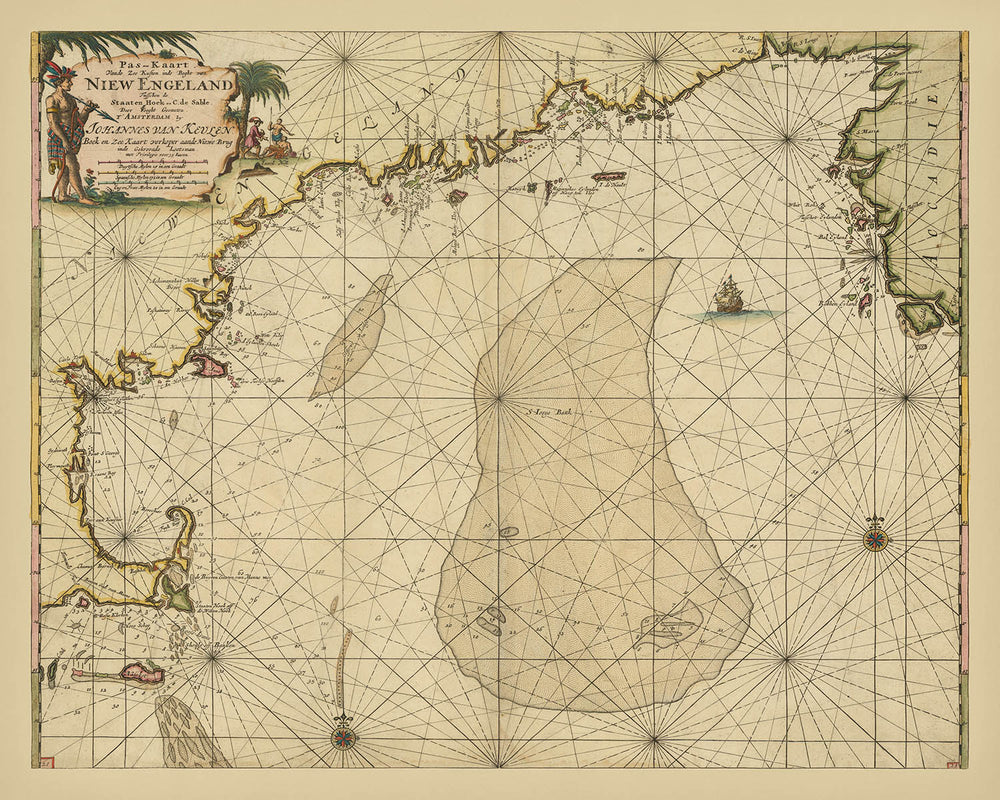 Old New England Nautical Chart by van Keulen, 1695: Cape Cod, Nantucket, Acadia (Nova Scotia)