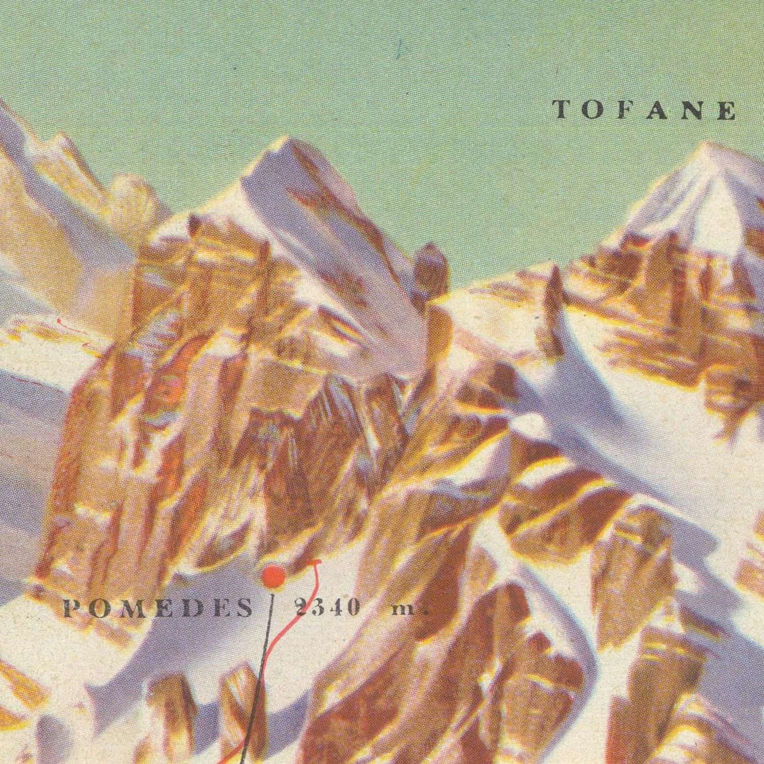 The geography unfolds with operatic clarity. To the west, the Tofane massif dominates, its Tofana di Rozes ramparts anchoring a stage on which alpine drama would play out. Southward, Pelmo rises with sculptural poise, while Civetta and Monte Pore extend the horizon in a rhythm of crenellated peaks. Eastward, Mte. Cristallo and the Col de Varda stand sentinel over Misurina and the mirror-bright Lago di Misurina; beyond lie Auronzo di Cadore and the pale terrace of the Altipiano delle Marmarole. Passo Falzarego and Passo Giau open classic approach routes, and Malga Ra Stua nestles amid forested slopes. Even distant Cima Tosa appears, a nod to the greater Dolomite cosmos that frames Cortina’s amphitheater of snow and stone.