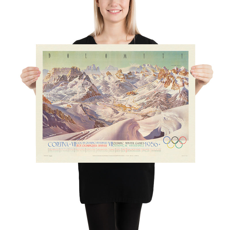 As a historical document, the map freezes a transformative winter. The VII Olympic Winter Games were among the first to be televised across Europe, projecting Cortina’s luminous scenery to a new mass audience and cementing Italy’s postwar renaissance in the Alps. The Soviet Union made its Winter Olympics debut here, reshaping competitive narratives and heralding a new era in sport. Berann’s multilingual labels speak to the Games’ internationalism, while the Olympic rings punctuate the sheet with quiet authority. Together, these elements preserve a precise cultural moment: mid-century Cortina as both glamorous resort and global arena, where the Dolomites became a shared visual language for sport, travel, and aspiration.
