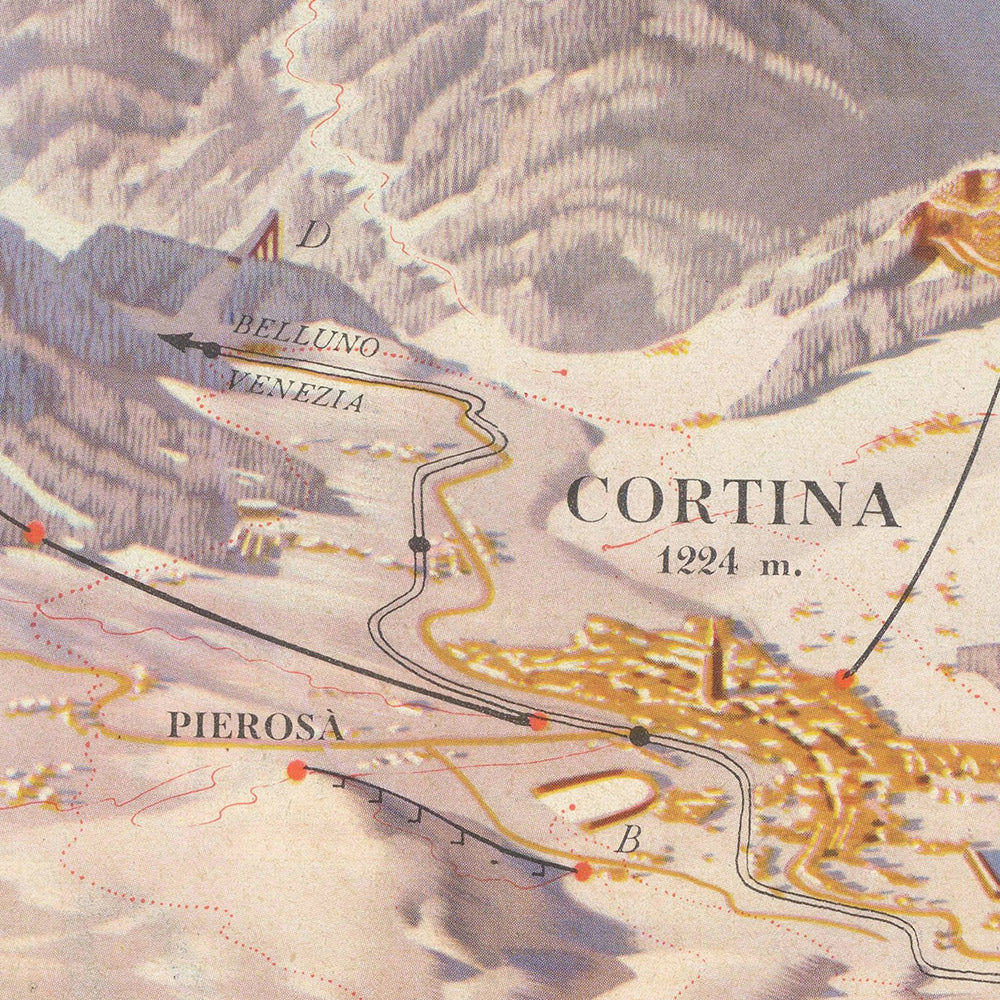 Berann threads the ski experience into this drama with elegant precision. Named pistes—100, 101, and 102—are clearly delineated, their arcs and fall lines rendered with the intuitive legibility that made his panoramas indispensable to winter sports enthusiasts. Routes glide across the flanks of Tofane and sweep toward Cristallo and Col de Varda, giving skiers and spectators alike a confident sense of orientation. The town of Cortina is the nexus, with approaches fanning outward to San Vito di Cadore and the high passes. Historically resonant details abound: Lago di Misurina, shown in crystalline poise, served as the stage for Olympic speed skating, while the surrounding slopes hosted marquee alpine disciplines—each venue elegantly situated in the broader mountain choreography.