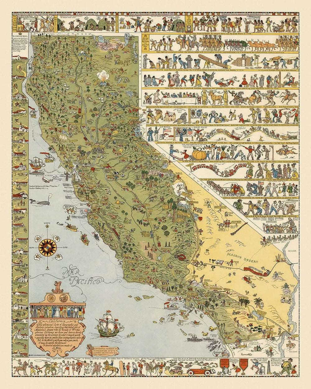 Jo Mora, un artista célebre por sus ilustraciones dinámicas, elaboró este mapa con una combinación única de narración temática y precisión geográfica. Su obra es un testimonio del vibrante tapiz cultural de California, que muestra no solo su belleza natural sino también los acontecimientos históricos que dieron forma a su identidad. El mapa es un festín visual, con ilustraciones detalladas que capturan la esencia del espíritu y la diversidad de California, lo que lo convierte en una pieza preciada tanto para coleccionistas como para entusiastas de la historia.