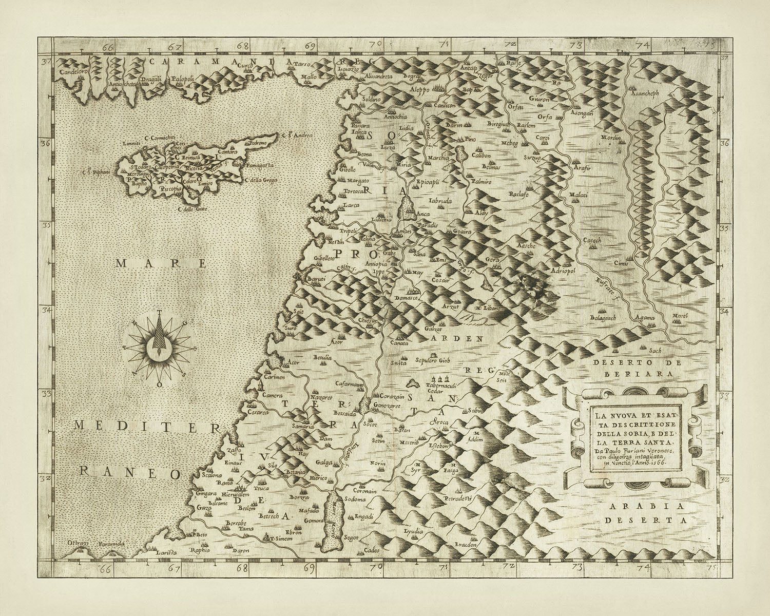 La importancia histórica de este mapa es profunda, ya que refleja la fascinación de la época moderna temprana por la Tierra Santa. Los mapas de esta región eran muy buscados, sirviendo tanto como herramientas de navegación como símbolos de devoción religiosa. El mapa de Forlani, con su rareza y exquisito detalle, representa un pináculo de la cartografía renacentista, capturando la imaginación y el respeto de su audiencia contemporánea y continuando inspirando admiración hoy en día.