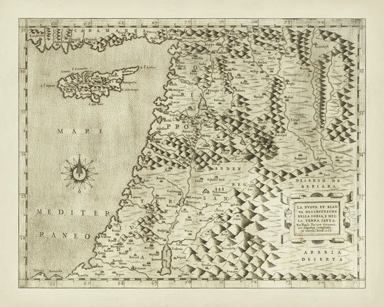 La Nuova et Esatta Descrittione della Soria, e Della Terra Santa, elaborada por el ilustre Paolo Forlani en 1566, es una obra maestra del arte cartográfico que captura la esencia de la Tierra Santa y Chipre. Este mapa, un excelente ejemplo del trabajo de la Escuela Lafreri, se extiende desde el Mar Muerto y Jerusalén en el sur hasta Alepo en el norte, ofreciendo una representación detallada y evocadora de una región impregnada de historia y significado religioso. El diseño intrincado del mapa y su rico contexto histórico lo convierten en una pieza codiciada tanto por coleccionistas como por historiadores.