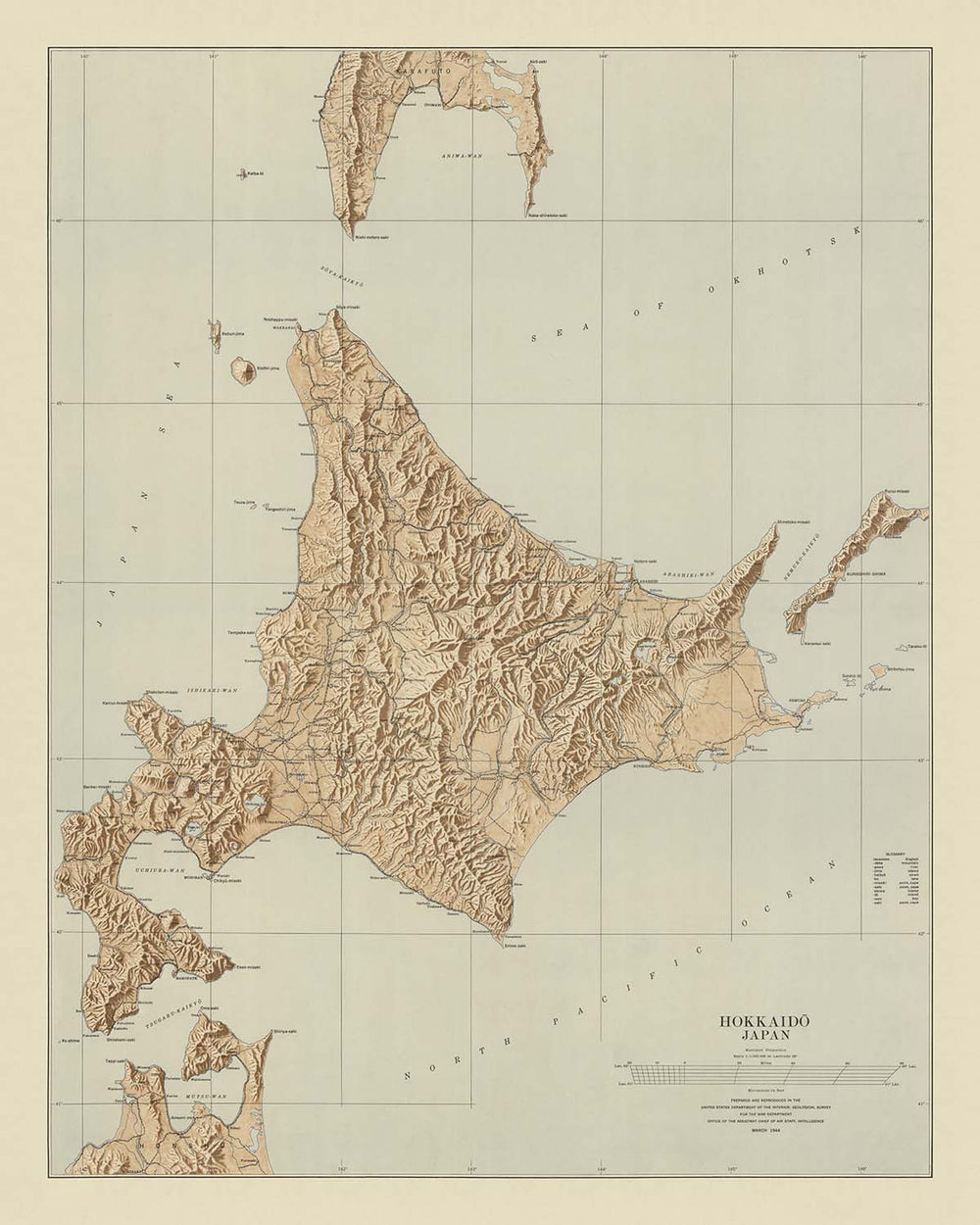 El mapa titulado "Hokkaido, Japón," elaborado en 1944 por el Departamento del Interior de los Estados Unidos, Servicio Geológico, para la Fuerza Aérea de EE. UU., es un notable testimonio de la excelencia cartográfica de su época. Este mapa no es solo una representación geográfica; es un artefacto histórico que captura los intereses militares estratégicos de la Segunda Guerra Mundial. Con sus detalladas características topográficas y efectos de relieve en 3D, ofrece una vívida representación del diverso paisaje de Hokkaido, convirtiéndolo en una pieza fascinante para coleccionistas y entusiastas de la historia por igual.