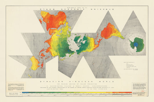 En esta edición, los colores vibrantes y los detalles intrincados del mapa capturan la imaginación, invitando a los espectadores a explorar sus muchas facetas. La escala de temperatura media anual baja añade una capa adicional de información, ofreciendo perspectivas sobre los patrones climáticos de la Tierra. Este elemento temático no solo mejora el atractivo estético del mapa, sino que también subraya el compromiso de Fuller con una comprensión holística de nuestro planeta.