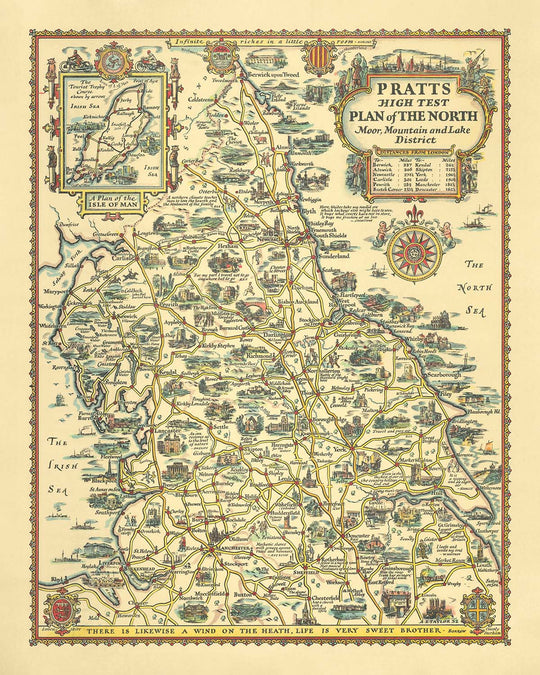 El contexto histórico de este mapa está profundamente entrelazado con el desarrollo del viaje por carretera y el turismo durante principios del siglo XX. Como producto de la Pratt's Petroleum Company, el mapa subraya la creciente importancia de la cultura del automovilismo, fomentando la exploración y la aventura. Este mapa no es meramente una representación de la geografía, sino un testimonio de una era donde la carretera abierta llamaba a los viajeros a descubrir las maravillas del norte de Inglaterra.