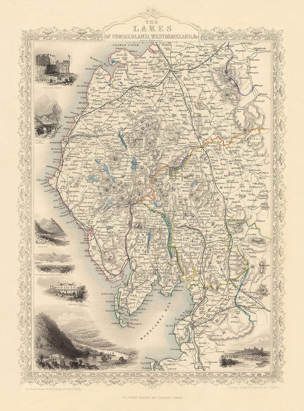 Alrededor de los bordes del mapa hay grabados detallados de hermosas vistas de Lakeland, incluyendo un par de Windermere, el Castillo de Lancaster, Keswick y Carlisle.