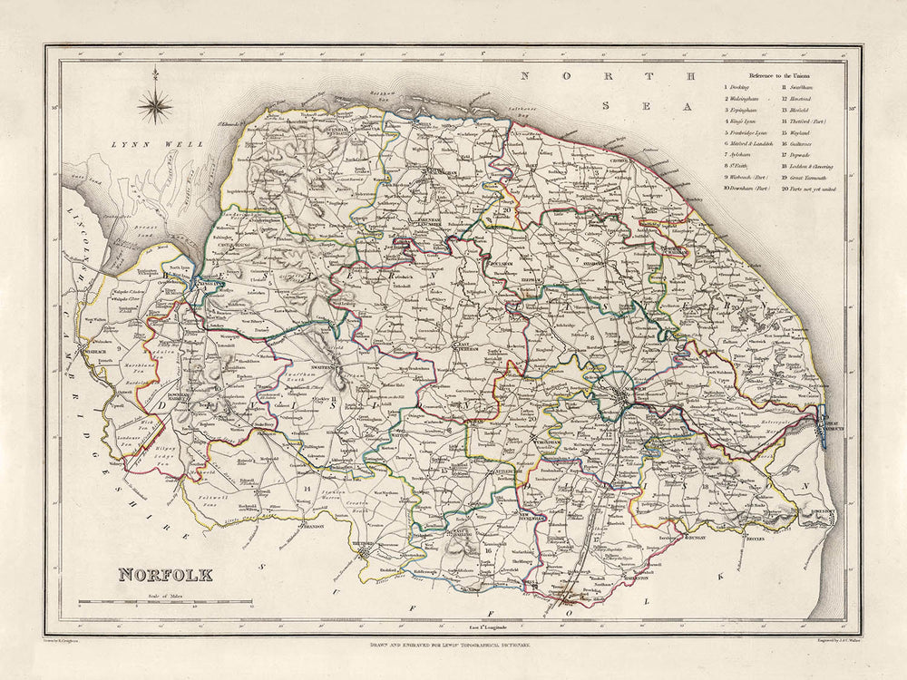 Retrocede en el tiempo con este hermoso mapa, intrincadamente detallado, del condado de Norfolk, dibujado por el estimado Samuel Lewis en 1844. Sumérgete en la belleza histórica de las tierras orientales de Inglaterra, antes de que los vastos cambios de la Revolución Industrial tuvieran pleno efecto. La cuidadosa atención al detalle de Lewis nos permite vislumbrar la forma de Norfolk tal como era hace más de un siglo y medio, contando la historia de su rica narrativa histórica. Algunas ciudades modernas pueden no estar presentes en este mapa, o podrías encontrarlas con un nombre anterior, lo que te brinda una perspectiva única del pasado de estos asentamientos.