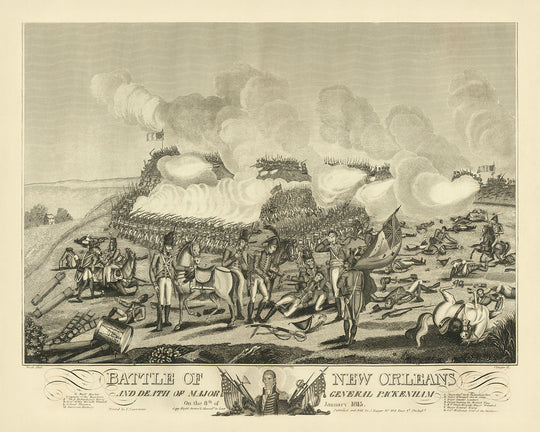 Esta obra de arte en particular se destaca no solo por su importancia histórica, sino también por su mérito artístico. La composición muestra a las tropas británicas avanzando mientras las defensas estadounidenses, lideradas por el General Andrew Jackson, permanecen firmes. El margen inferior de la impresión honra a Jackson, destacando su papel fundamental en asegurar la victoria estadounidense. La influencia de la célebre obra de Benjamin West "La Muerte del General Wolfe" se puede ver en los meticulosos detalles y el peso emocional de la escena, ofreciendo un profundo comentario sobre los costos del conflicto.