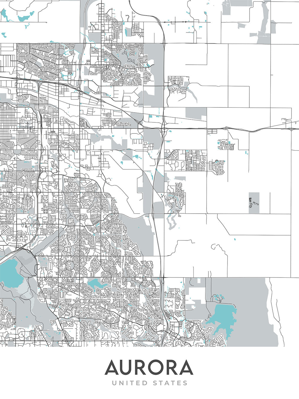 Este mapa de Aurora, Colorado, es un callejero moderno y detallado sin etiquetas, perfecto para agregar un toque de estilo contemporáneo a la decoración de su hogar. El mapa cubre un área generosa, abarcando una amplia gama de vecindarios, carreteras principales y puntos de referencia, todos presentados en un formato visualmente impactante y fácil de leer.