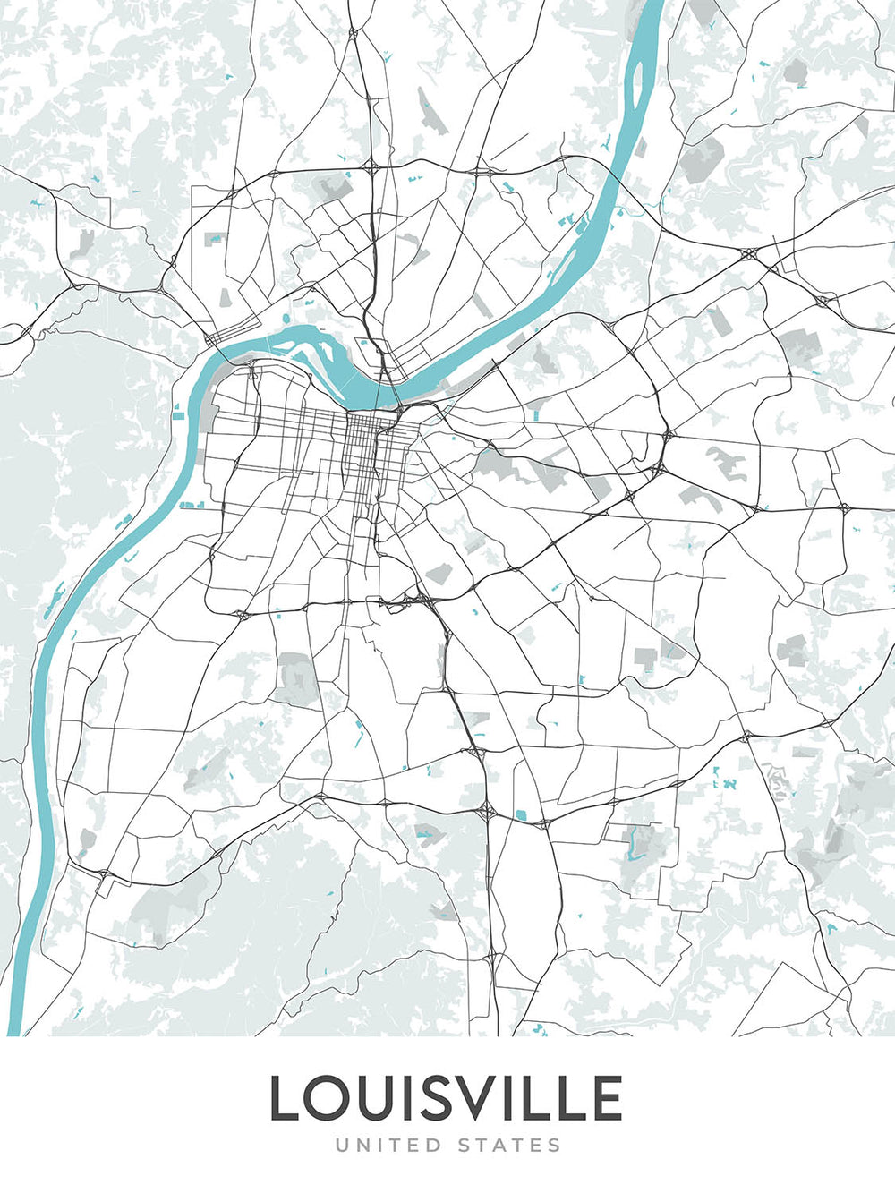 Mapa moderno de la ciudad de Louisville, KY: centro, antiguo Louisville, Highlands, Muhammad Ali Center, Churchill Downs