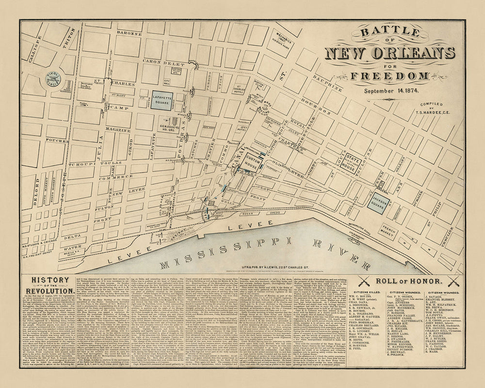 La importancia histórica de este mapa se extiende más allá de su detallada cartografía. Sirve como un recordatorio conmovedor de las luchas políticas y sociales más amplias de la era de Reconstrucción. Las secciones "Lista de Honor" y "Historia de la Revolución" ofrecen una narrativa de valentía y sacrificio, al tiempo que arrojan luz sobre los esfuerzos controvertidos y a menudo violentos para dar forma al futuro de Luisiana. Este mapa no es solo una representación de una ciudad; es un testimonio de un momento crítico en la historia estadounidense, capturado a través del experto lente de Thomas Sydenham Hardee.