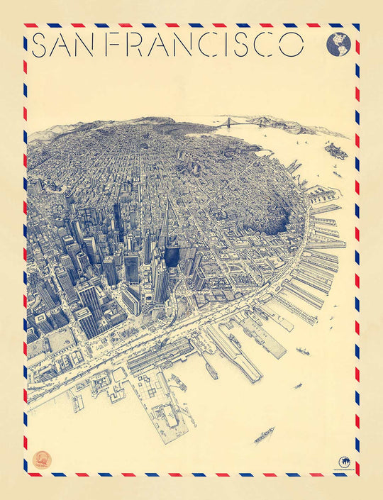Mapa de ojos Old Birds de San Francisco en 1982: Rascacielos, Área de la Bahía, Puente Golden Gate, Distrito Financiero, Nob Hill