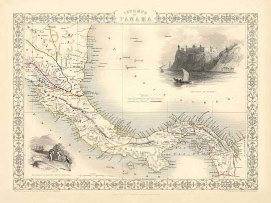 John Tallis & Company, con su compromiso con la precisión y la estética, presenta un mapa que no solo es una herramienta de navegación, sino también una obra de arte. La grabado detallado y colorido, adornado con un borde decorativo, da vida a la geografía física y política del Istmo de Panamá. El mapa describe meticulosamente las rutas propuestas del Canal de Panamá y el Ferrocarril de Panamá, resaltadas en rosa, capturando el espíritu de innovación y los sueños que alimentaron los ambiciosos proyectos de la época. La inclusión de ilustraciones in situ, como buscadores de oro atravesando las Cordilleras y el fuerte en Chagres, enriquece la narrativa, ofreciendo vislumbres de los desafíos y aventuras que esperaban a aquellos atraídos por esta tierra de promesas.