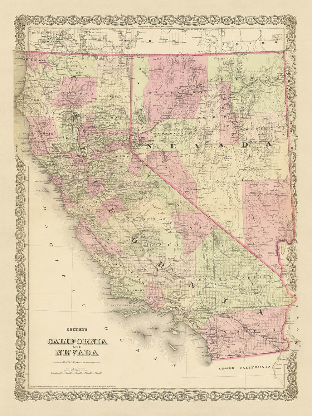 Mapa antiguo de California y Nevada por JH Colton, 1875: San Francisco, Sacramento, Los Ángeles, Carson City y Virginia City