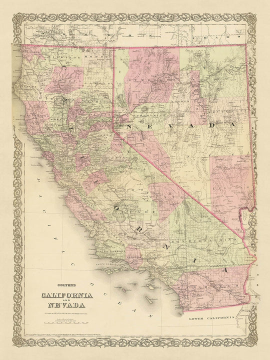 Retroceda en el tiempo con este exquisito mapa de California y Nevada de 1875, elaborado magistralmente por el renombrado cartógrafo estadounidense JH Colton. Esta pieza no es sólo un mapa, sino una ventana a la historia temprana de los Estados Unidos, que ofrece una perspectiva única sobre la evolución de estos dos estados importantes. El mapa, que es un testimonio de la habilidad y precisión excepcionales de Colton, captura el paisaje tal como era a finales del siglo XIX, una época en la que muchos de los asentamientos que conocemos hoy aún no se habían fundado.