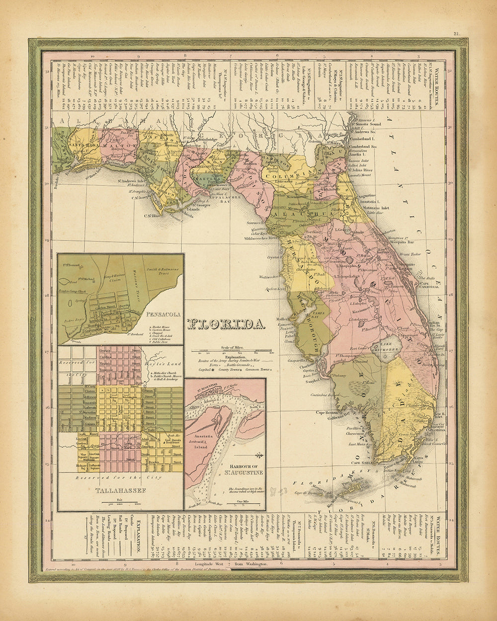 El excelente trabajo de Tanner permite que este mapa ofrezca mucho más que conocimientos geográficos. Es un diálogo histórico, en el que se destacan los asentamientos fundados oficialmente en 1839, y ofrece al espectador una intrigante perspectiva de la transformación de Florida a lo largo de los siglos. El encanto y el valor de este antiguo mapa no sólo proceden de lo que revela, sino también de lo que omite: las ciudades aún por fundar que un día darían forma a la identidad de Florida. Esta interacción única de historia revelada y oculta hace de este mapa un recuerdo inestimable tanto para coleccionistas como para entusiastas de la historia.