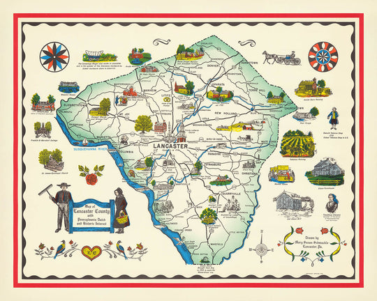 The “Map of Lancaster County with Pennsylvania Dutch and Historic Interest,” created in 1949 by Mary Susan Schmuckle, is a captivating pictorial and thematic city map that immerses viewers in the rich cultural tapestry of Lancaster County, Pennsylvania. Schmuckle’s artistry and attention to detail bring to life the unique Pennsylvania Dutch heritage, with hand-drawn illustrations that celebrate the region’s historic landmarks, agricultural roots, and vibrant communities. This map is more than a navigational tool—it is a visual storybook that captures the spirit of Lancaster County at a pivotal moment in its history, just after World War II.