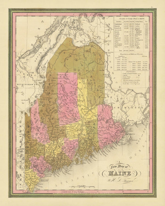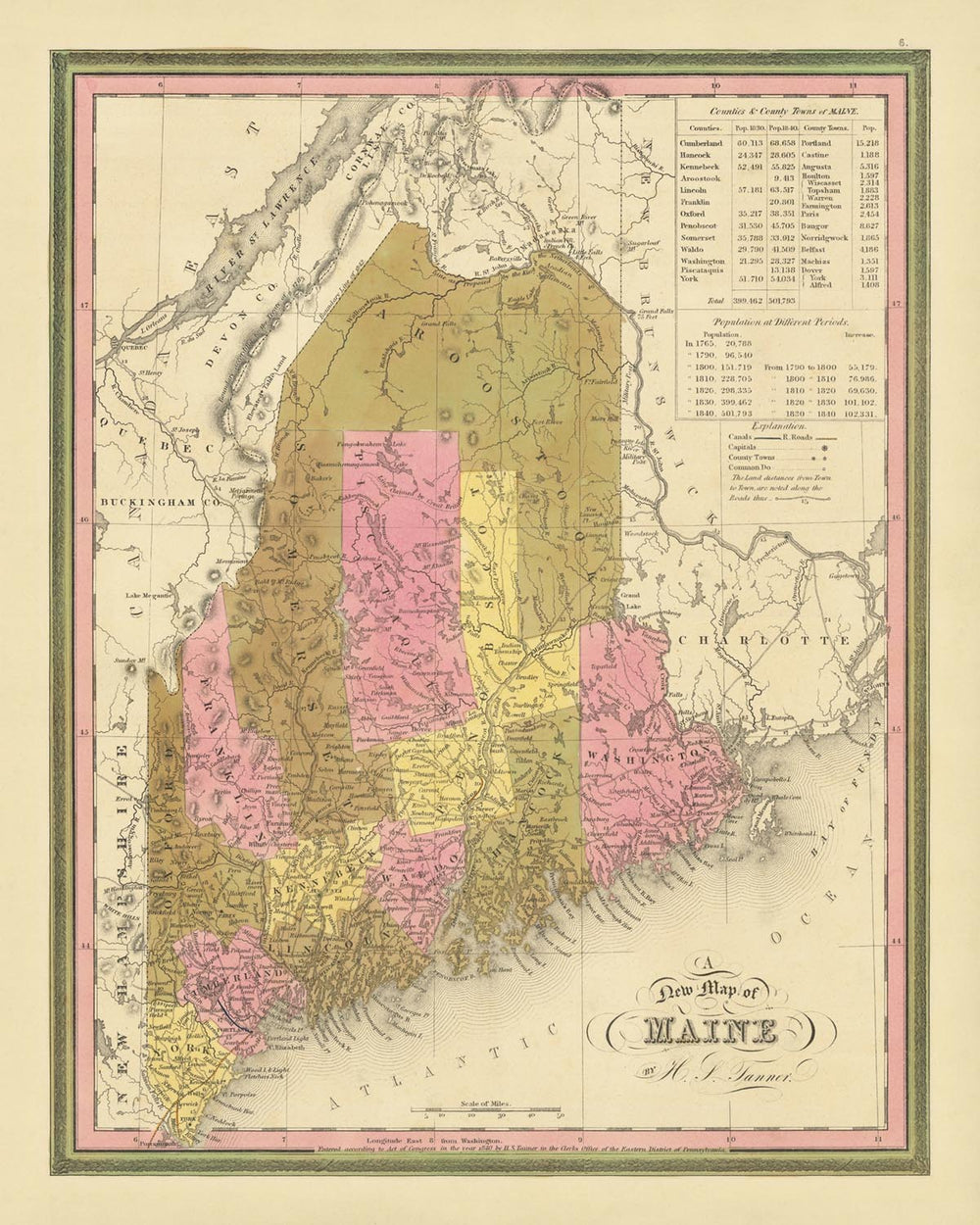 Este mapa bellamente detallado de Maine de 1840 de Henry Schenck Tanner es una mirada fascinante al estado en los primeros días de su condición de Estado. El mapa está coloreado a mano y presenta una gran cantidad de información, incluidas ciudades y pueblos, carreteras y ferrocarriles, ríos, lagos y montañas.
