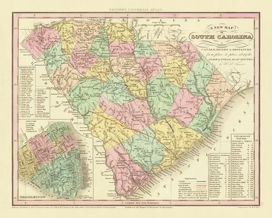 Esta hermosa reproducción de un mapa de Carolina del Sur de 1836 de Henry Schenck Tanner es imprescindible para cualquier aficionado a la historia o entusiasta de la cartografía. El mapa presenta información detallada sobre las carreteras, canales y distancias del estado, así como sobre sus ciudades, pueblos y condados. También incluye una gran cantidad de información histórica, como los lugares de batallas importantes y los nombres de los primeros colonos.