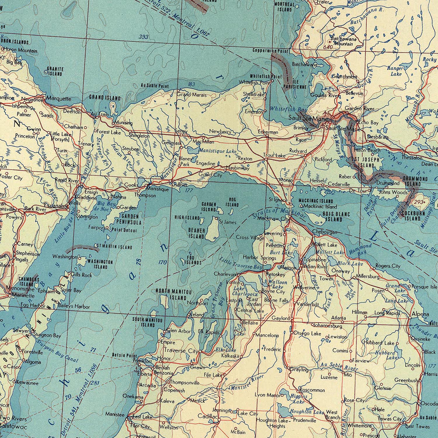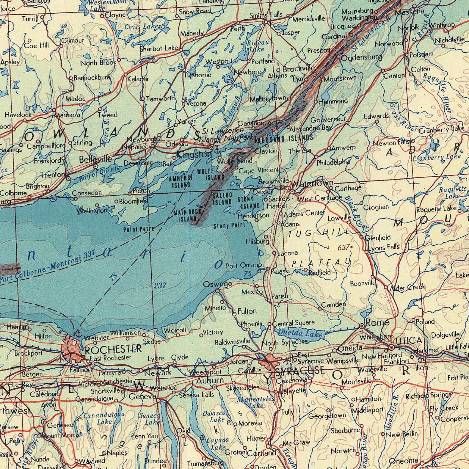 El Lago Huron, famoso por su archipiélago de islas, es otro punto focal de este mapa. La intrincada costa del lago y las ciudades que se asientan a lo largo de sus orillas están meticulosamente ilustradas. El Lago Ontario y el Lago Erie, el más oriental y el más meridional de los Grandes Lagos, respectivamente, también están destacados de manera prominente. Estos lagos, con sus bulliciosos puertos y sitios históricos significativos, juegan un papel crucial en el comercio y la historia de la región.