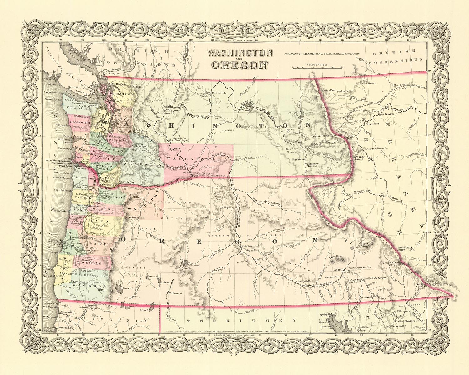 Sumérgete en la rica historia de los Estados Unidos con este exquisito mapa antiguo de Washington y Oregón de 1859, elaborado por el estimado cartógrafo JH Colton. Conocido por su meticulosa atención al detalle y la calidad excepcional de su trabajo, Colton es ampliamente reconocido como uno de los mejores cartógrafos estadounidenses de su época. Este mapa es un testimonio de su habilidad y dedicación y ofrece una visión fascinante del pasado.