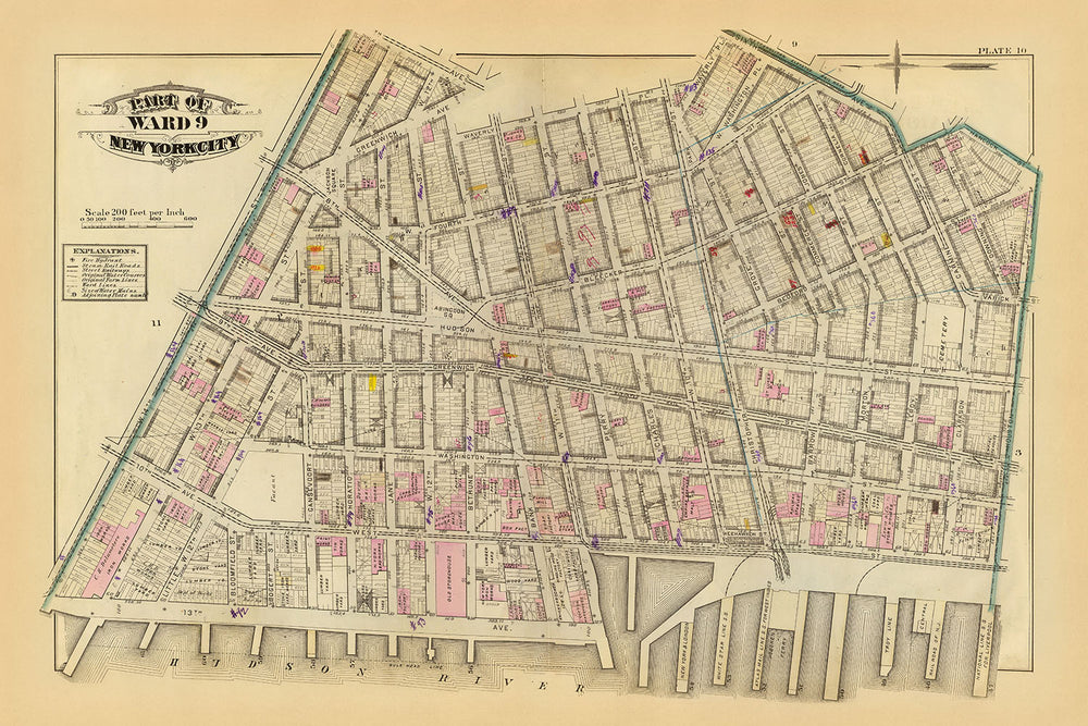 Destacan espacios verdes notables como Abingdon Square y Jackson Square, lo que refleja su papel duradero como puntos de reunión de la comunidad. La leyenda del mapa señala la presencia de bocas de incendio, vapor y tranvías, sugiriendo los avances tecnológicos de la época. Además, los cursos de agua originales, las líneas agrícolas y los límites de los distritos brindan una visión del paisaje histórico anterior al desarrollo urbano moderno.