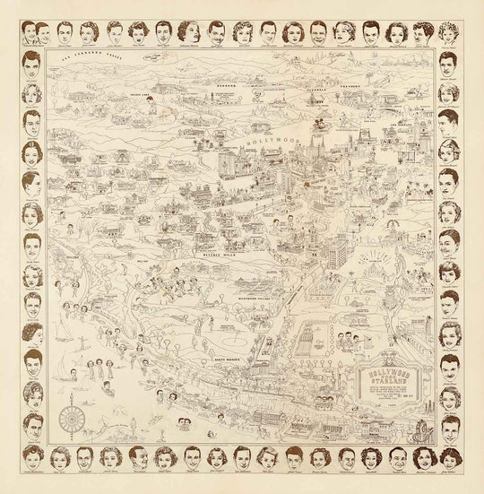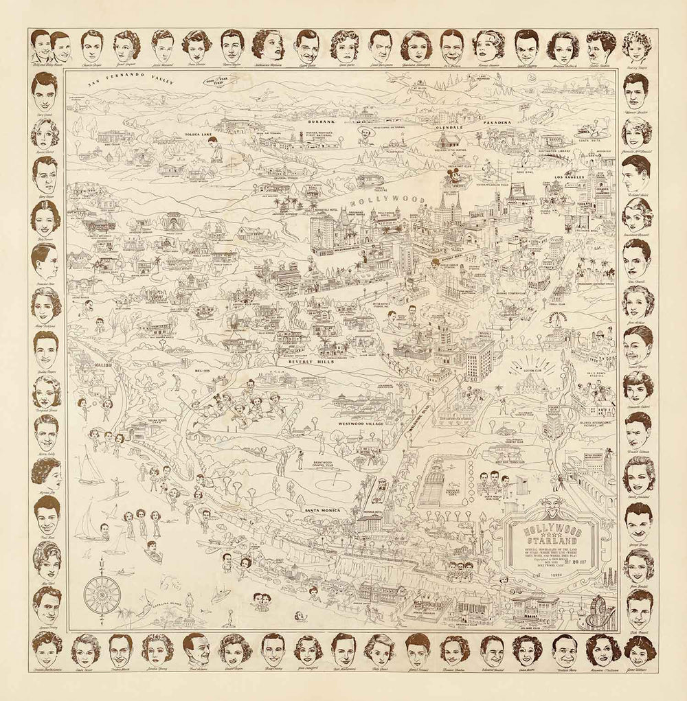 Este mapa tiene muchos retratos de famosos artistas rodeando el mapa, como Charlie Chaplin, Cary Grant, James Stewart, Katherine Hepburn y Shirley Temple. Dispersas alrededor del mapa hay ilustraciones de lugares emblemáticos, carreteras y edificios, como los estudios responsables de muchas de las grandes películas taquilleras de hoy, como los Estudios Walt Disney, los Estudios 20th Century Fox y los Estudios Paramount.