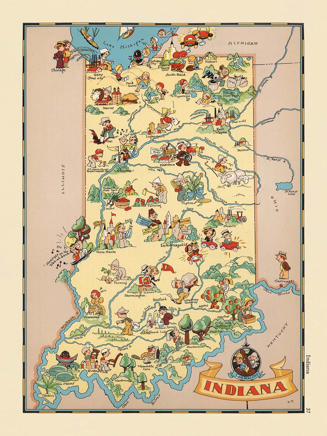 Pictorial Map of Indiana by Ruth Taylor White, 1935: Indianapolis, Fort Wayne, Evansville, Wabash River, Industry Icons