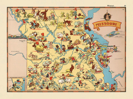 - Themes depicted: The map uses playful and exaggerated illustrations to represent stereotypical scenes, industries, and cultural elements associated with Missouri in the 1930s.