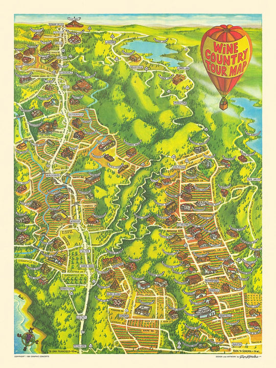- Mapa decorativo del Valle de Napa y Sonoma, ilustrando 94 bodegas.