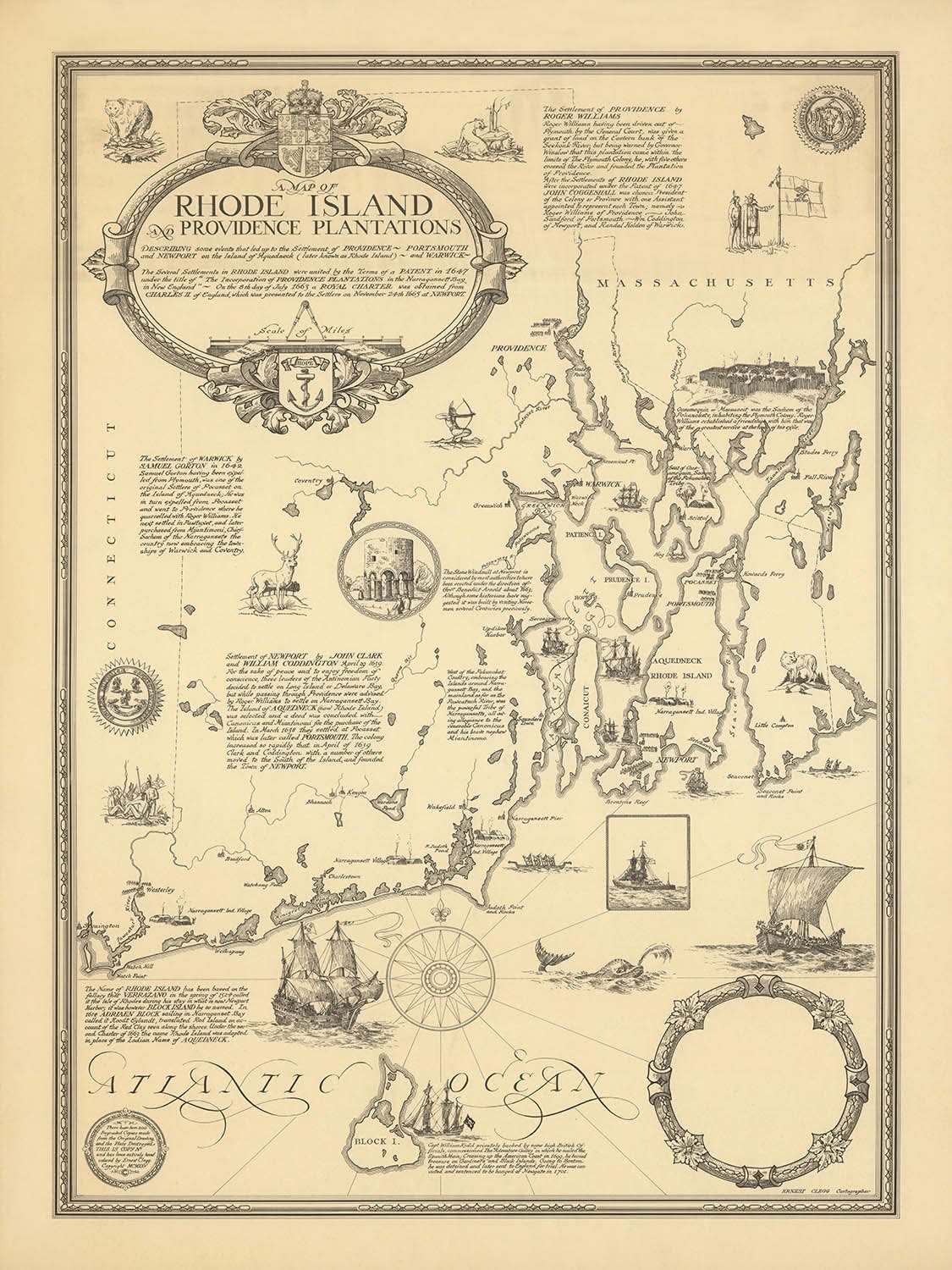 El mapa cubre la totalidad de Rhode Island, extendiéndose hacia partes de Massachusetts y Connecticut, con el Océano Atlántico bellamente representado a lo largo de su borde oriental. Muestra la costa detallada de Rhode Island, destacando sus bahías, ensenadas e islas. Un mapa insertado de Block Island agrega profundidad a la representación geográfica. El enfoque temático del mapa es evidente en la inclusión de anotaciones históricas y representaciones artísticas de figuras nativas americanas, asentamientos coloniales y primeros exploradores, ofreciendo una ventana al pasado.