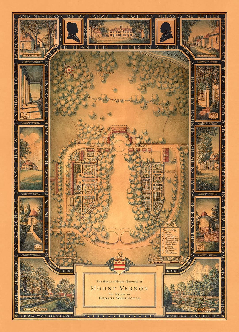 Alrededor del exterior del mapa hay una cita de una carta que Washington envió al administrador de Mount Vernon: "No escatimaré ningún gasto razonable que contribuya a la mejora y pulcritud de mis granjas, pues nada me agrada más que verlas en buen estado, y todo ordenado, hermoso y próspero."