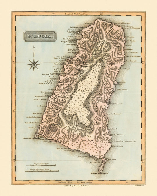 Fielding Lucas Jr. fue una figura pionera en la cartografía estadounidense, conocido por su dedicación a la creación de mapas detallados y precisos. Su trabajo en el mapa de Santa Lucía refleja su compromiso con la calidad y la precisión. Las intrincadas líneas del mapa representan vívidamente el terreno montañoso de la isla, proporcionando una comprensión clara de su paisaje accidentado. La atención de Lucas al detalle se extiende a las características costeras, donde los puntos, bahías y otros puntos de referencia están meticulosamente marcados, ofreciendo información valiosa para los navegantes y colonos de la época.