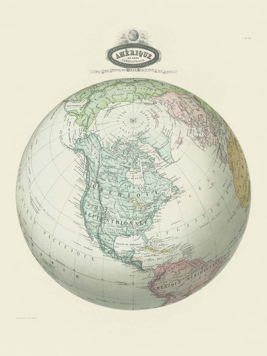 Antigua Mapa Esférico de América del Norte por Garnier, 1860
