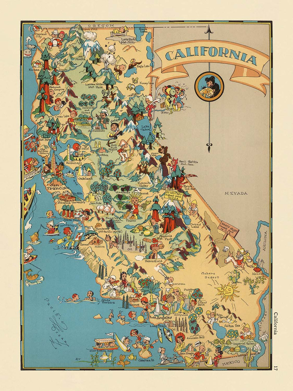 Pictorial Map of California by Ruth Taylor White, 1935: Los Angeles, San Francisco, Yosemite, Sierra Nevada, Hollywood