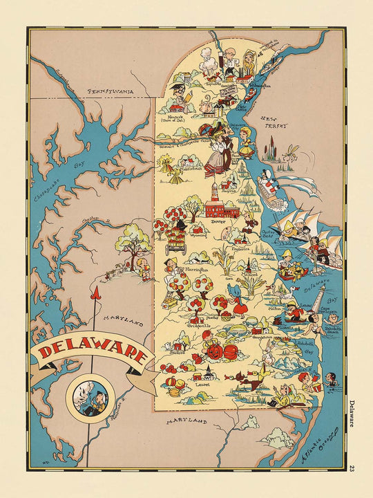 Completing this captivating portrait are the state’s towns and cities, each rendered with a charm that reflects their modern-day prominence. Wilmington, Dover, Newark, and Middletown, among others, are artfully depicted, their locations anchoring the map in both time and place. The inclusion of these settlements, alongside evocative images of local wildlife and natural resources, creates a layered narrative that invites viewers to explore Delaware’s past and present. For collectors and enthusiasts, this map is not only a visual delight but also a meaningful artifact—an invitation to journey through the storied landscapes and vibrant culture of Delaware as seen through the eyes of one of America’s most distinctive mapmakers.